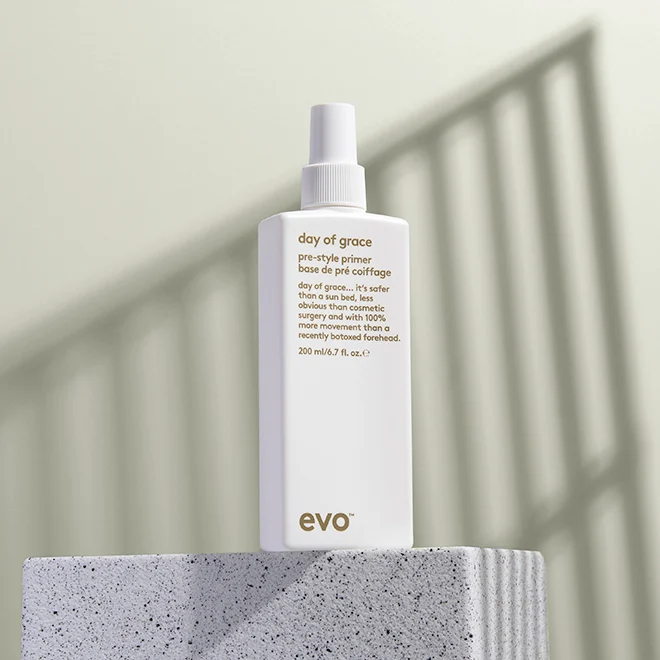 La base de pré-coiffage « Day of grace » par Evo est un soin coiffant léger sans rinçage qui prépare les cheveux au coiffage en les démêlant et en améliorant leur état, tout en les protégeant de la chaleur et des dommages causés par les rayons UV.